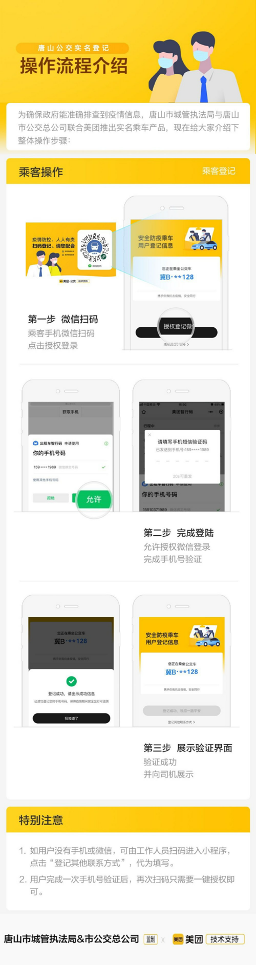 該實名制登記系統(tǒng)是唐山市城管執(zhí)法局、唐山公交總公司與美團公交合作開發(fā),已覆蓋所有公交車,實現了“一車一碼”。登記的相關信息使用專用服務器予以加密保存,既杜絕了登記信息泄露的風險,又可有效減少因手工登記帶來的接觸風險。在此倡議乘客朋友積極配合、文明乘車,有序排隊掃碼登記,請予理解和支持。