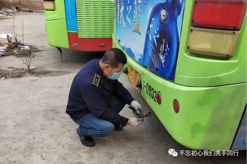 3月22日一大早,伴隨著“轟轟”的發(fā)動機聲,118路司機竇玉海將韓城李莊子車場內停駛的30部公交車一一“喚醒”。“車輛長期停駛,電瓶容易虧電,會導致車輛打不著火,所以隔幾天就要啟動一次。”啟動完車輛后,竇玉海又馬不停蹄地對車輛技術狀況、車載安全設施正常使用情況進行了認認真真的逐車檢查。一通忙碌下來將近三個小時,此時他又踱步在場區(qū)的角角落落開始了消殺工作。